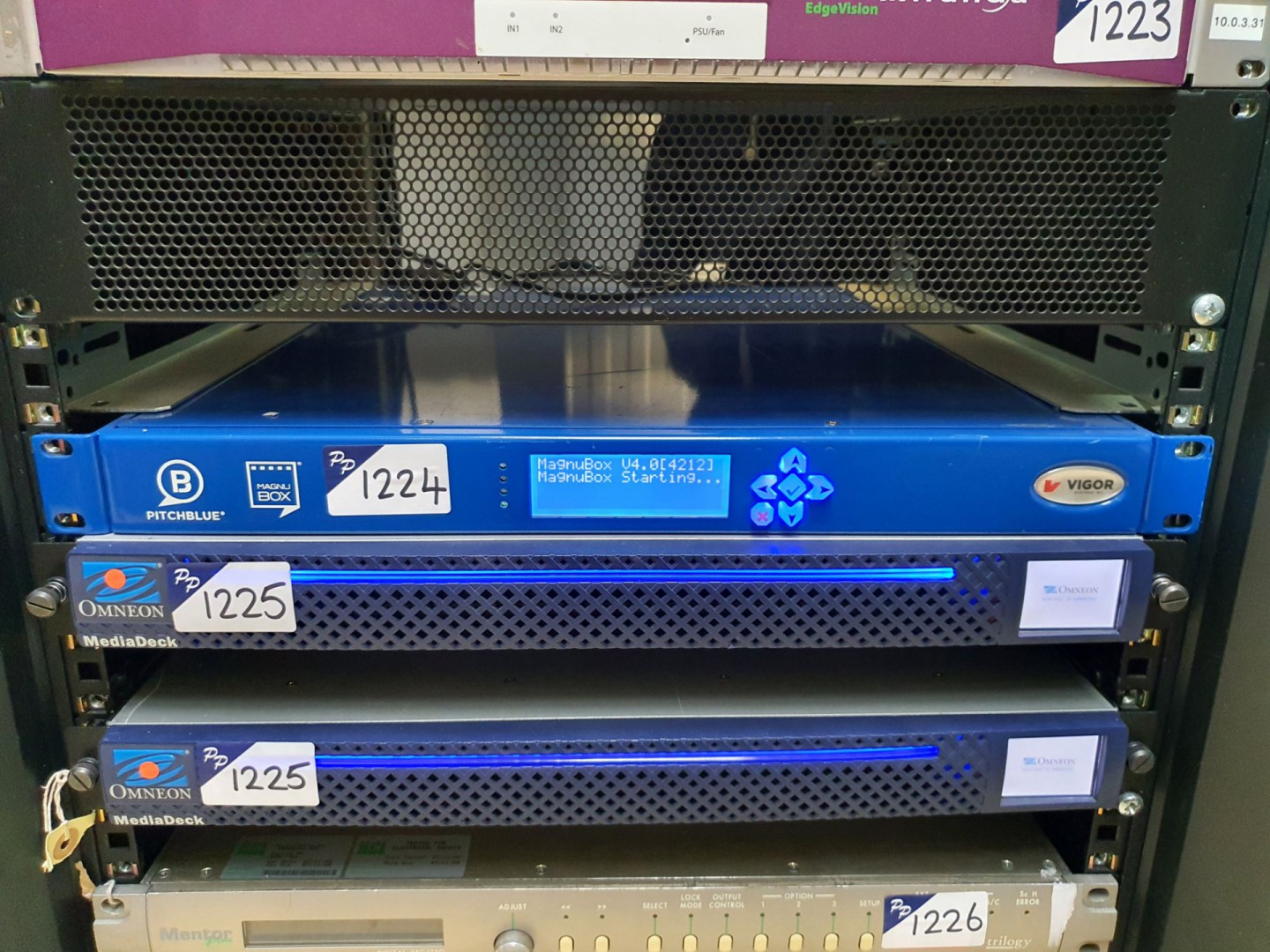 Voltech PM1000 AC power analyser. RS Testo 440 vane probe anemometer. Astro SL-7036 sync generator. Cobalt HD8024 HD / SD format converter. Purex filter fume extractors. Grass Valley DD external power supply. Gefen A/V cinema scalar Pro II Omneon Media decks. Miranda CR3232-AV audio video router. AJA KiPro rack disk recorder. RS Seaward PAT1000S PAT tester. Quantel Pablo Neo 4K paint & graphics controller. SAM IQ Edge chassis. Quantum Scalar i80 tape library. SAM Quantel Rio. ProBel Morpheus integrated content engines. Quantel 2116 platform units. Grass Valley K Frame video production centre. Grass Valley & Snell Sirus 600, 830 & 840 chassis / routers. Miranda NVision NV5100MC multichannel master control switcher. Snell & Wilcox Kahuna SD/HD production switchers. AJA Kumo Compact Sdi router. Arri 650Plus studio lights. 4x Sony PVM-9042QM composite CRT studio monitors. JVC TM1010 & TM1051D composite / component studio CRT monitors. Ikegami PM404 B&W CRT monitors. Sony BVM-D14HSE grade 1 studio CRT monitors. Vutrix 24HR quad LCD monitors. Tascam DA-78 8 track digital audio multitrack recorder. RME ADI-6432 bi-directional Madi to AES converter. RME Octamic Mic Pre & PSU. 2x Axon frames with plug in cards. RTS Telex comms system. Snell & Wilcox video router system. For-a HVS 350 vision mixer system. Snell & Wilcox Kahuna vision mixer system. Miranda audio bridge terminal. Nvidia Tesla, Nvidia Quadro etc graphic cards. Sony LMD-2020 LCD monitor. Meynell isolating transformers. SRM 100/3 surface resistivity / resistance meter. AJA HD10AVA dual rate HD / SD audio video A/D converter. Rubidium Series 1 universal video data processor. AJA CRV88-9-S-NCI Corvid 88 multi-stream, multi-format PCIe I/O card. AJA CRV44-S-NCI Corvid 44 flexible multi-format I/O card, etc etc.