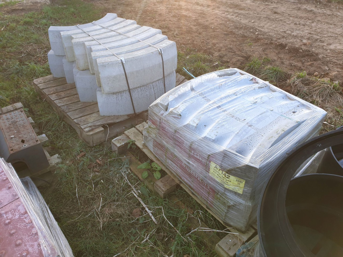 Qty various Marshalls 2100 concrete channels tops / lids, concrete drainage rings, steel drainage boxes, various size rubber feet, concrete kerb edging, saddle flanges, ducting, connectors, kerb drains, concrete edging, concrete gully channels, manhole lids etc.