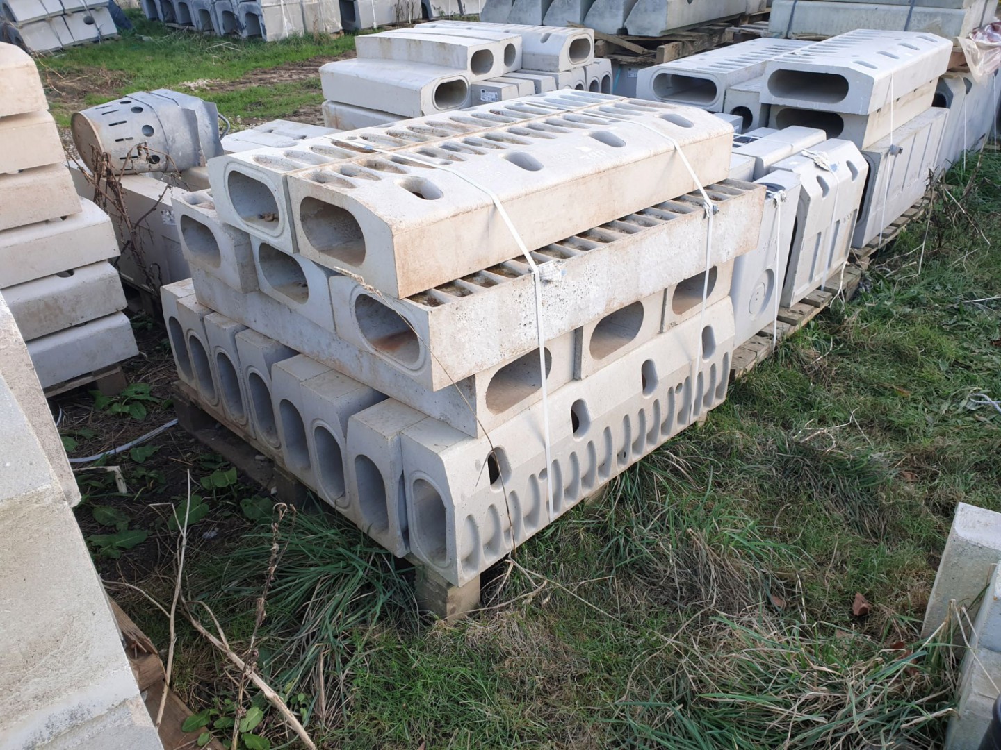 Qty various Marshalls 2100 concrete channels tops / lids, concrete drainage rings, steel drainage boxes, various size rubber feet, concrete kerb edging, saddle flanges, ducting, connectors, kerb drains, concrete edging, concrete gully channels, manhole lids etc.
