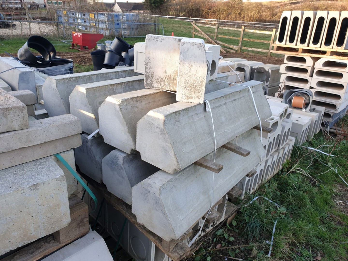 Qty various Marshalls 2100 concrete channels tops / lids, concrete drainage rings, steel drainage boxes, various size rubber feet, concrete kerb edging, saddle flanges, ducting, connectors, kerb drains, concrete edging, concrete gully channels, manhole lids etc.