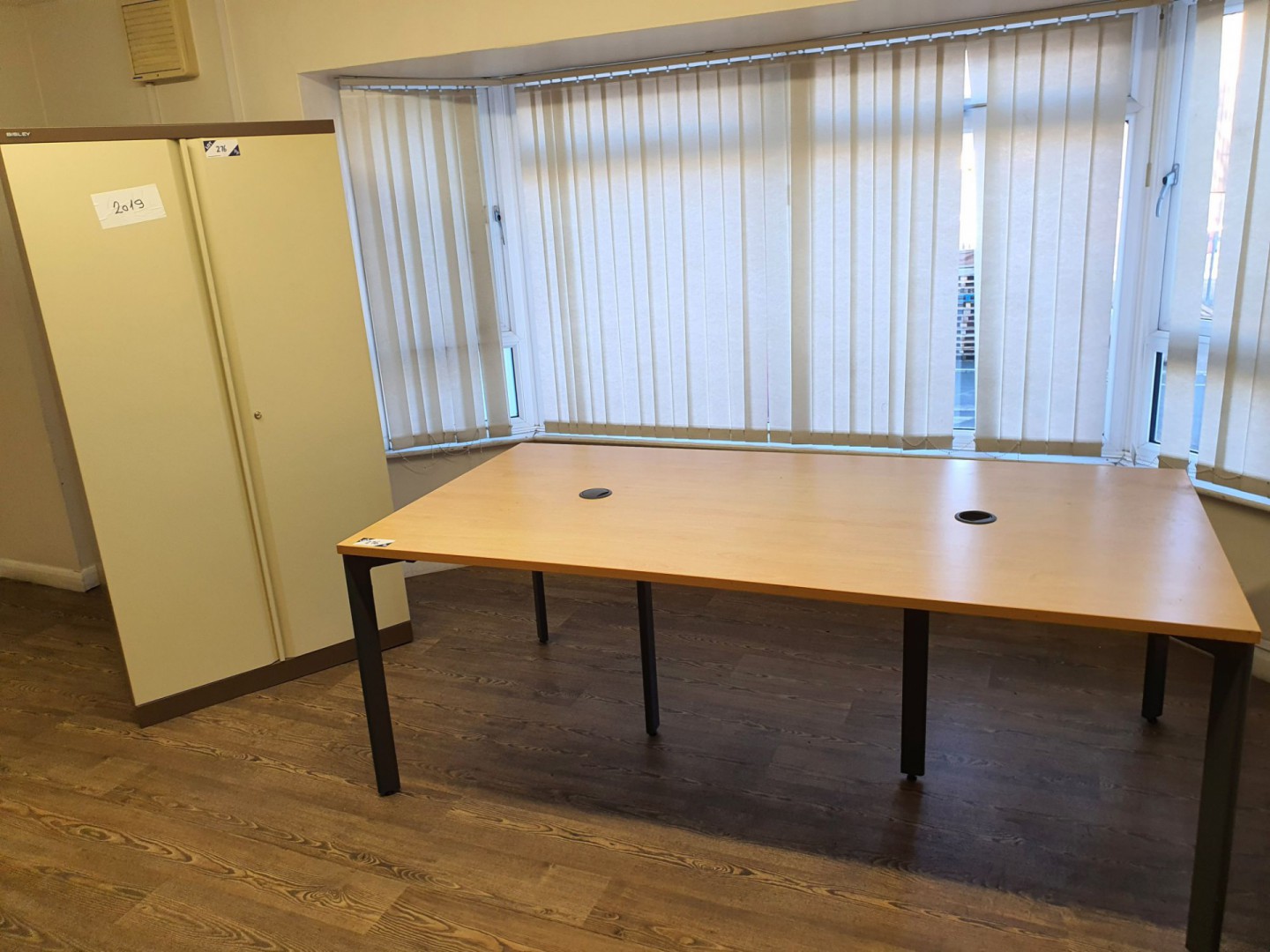Beech effect meeting table, 1000x2000mm, Bisley cream / brown 2 door storage cupboard, 920x1800x450mm - Lot Located at: Corby, Northamptonshire