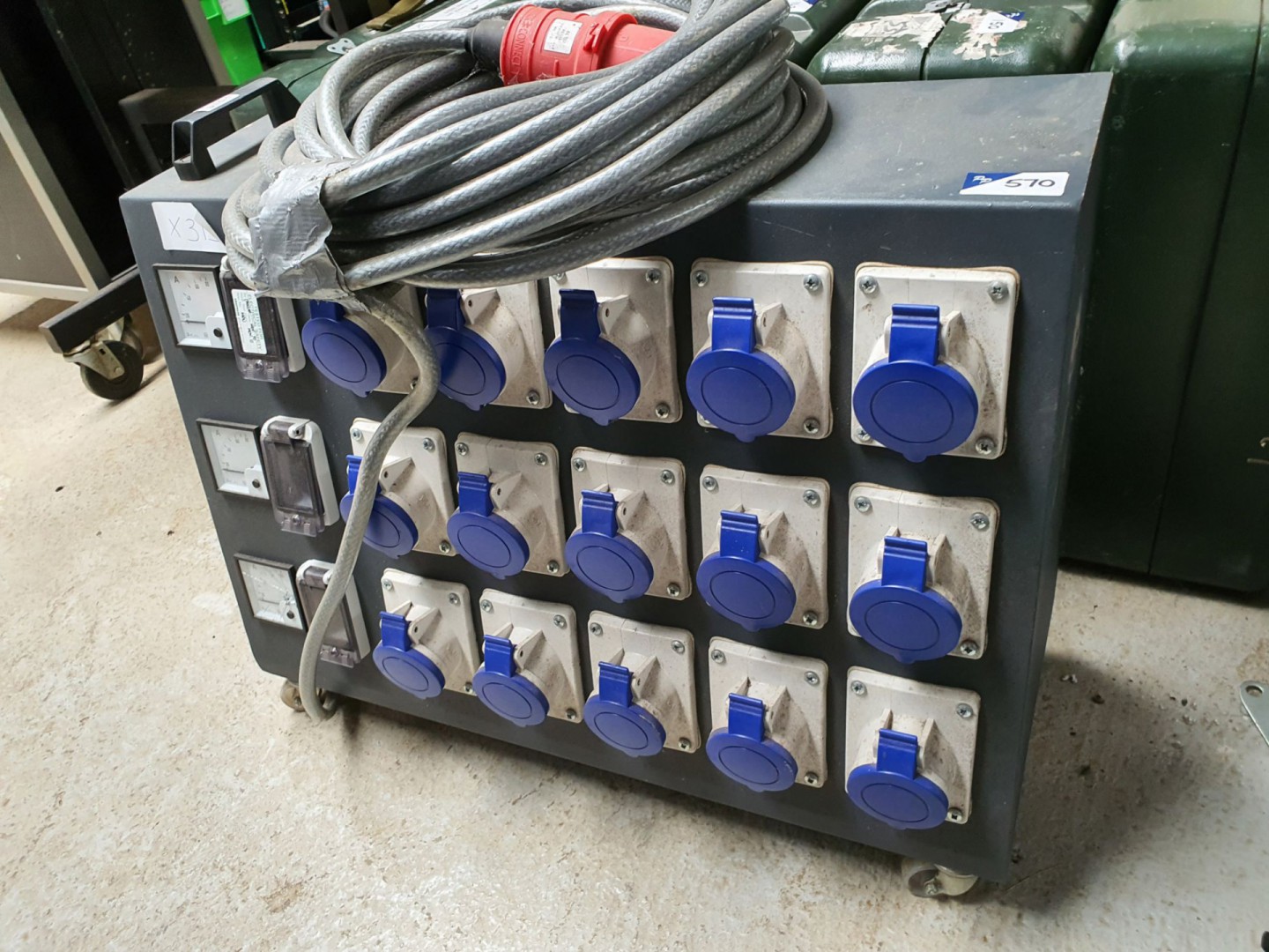 K9 mains distribution unit, 3 phase to 3 x 1 phase with meters & trips, 15 output connectors