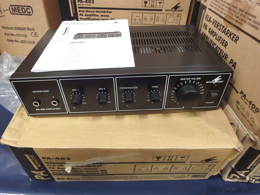 2x Monacor PA-402 mono PA amplifiers, 20W RMS (boxed & unused) - Lot located at: Kingscliffe