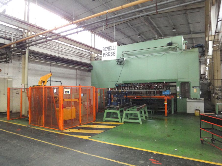 BENELLI 20 STATION (Plus Blanking Station) TRANSFER PRESS - Model: PMT/TE/160/20/+1, Electronica VT440 CNC control. 4000mm x 600mm bed, 1650kW. Decoiler, Straightener and Blanking station with programmable shuttle stagger & hydraulic shear, chilled water cooling system Die Cushions, twin quick change tool facility 3.5 Die sets, 15m x 12m approx footprint, (No specific product tooling included) (No pit) (1995) - Lot located at: Llantrisant, Rhondda Cynon Taff, Wales