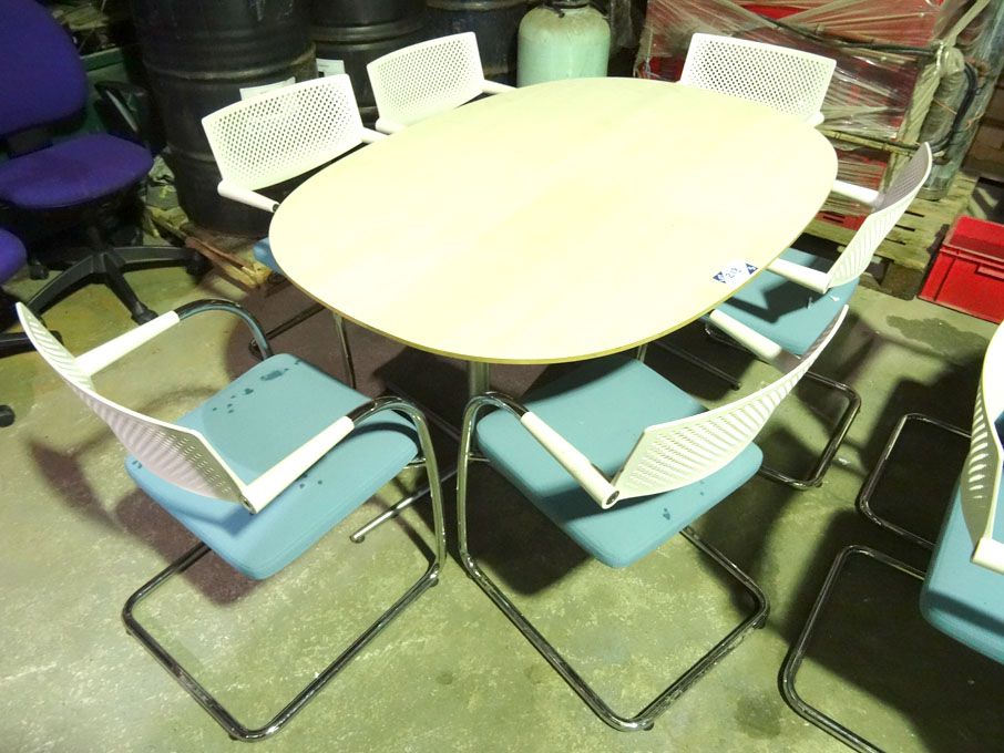 Maple 1600x1100 oval frame meeting table with 6x Vitra blue upholstered, chrome frame chairs - Lot located at: PP Saleroom, Aunby, Lincolnshire
