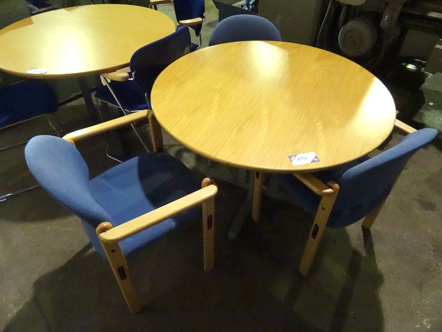 Light oak 42" dia meeting table with Antocks Lairn blue upholstered wooden frame chairs - Lot located at: PP Saleroom, Aunby, Lincolnshire