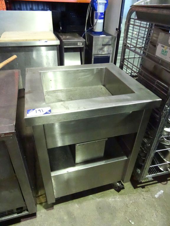 Mobile stainless steel chip serving tray, 490x440x150mm ID - Lot located at: PP Saleroom, Aunby, Lincolnshire