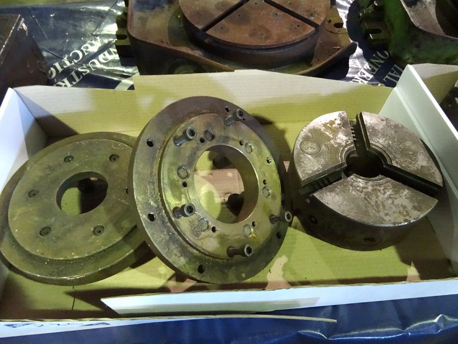 Qty lathe spares inc: face plates, 2,3 & 4 jaw chucks etc in 2 boxes - lot located at: Aunby, Lincolnshire