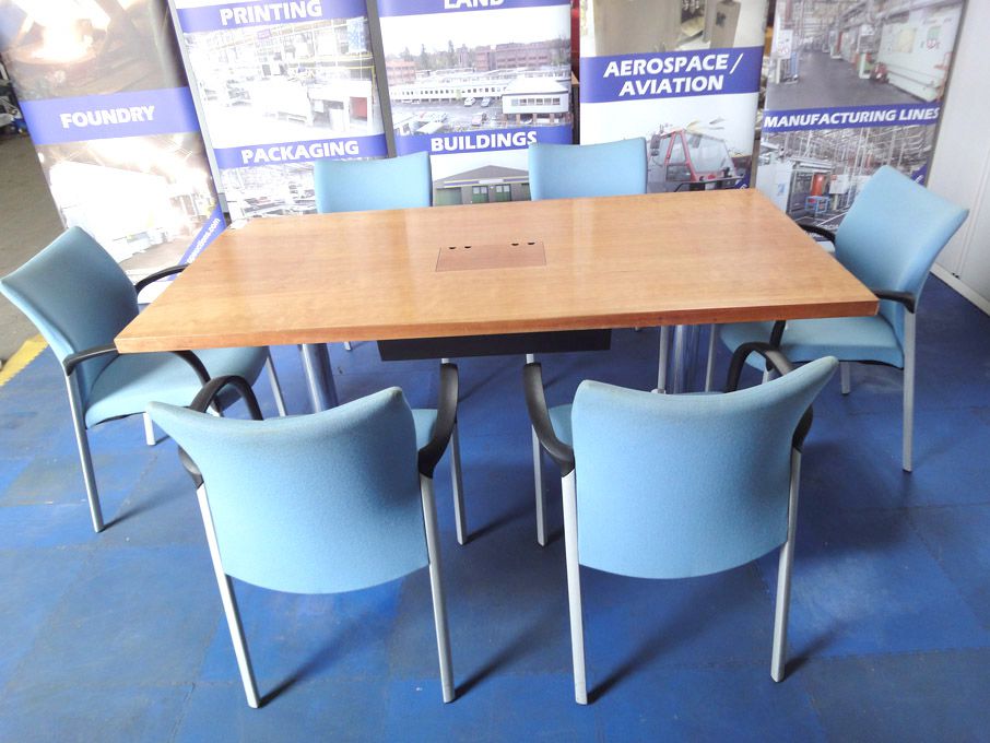 1800x900mm wooden meeting table with 6x Preston blue upholstered chairs - lot located at: Aunby, Lincolnshire