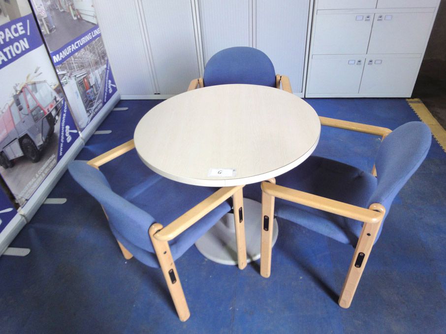 800mm dia round wooden table with 3x Antocks Lairn blue upholstered stackable wooden chairs - lot located at: Aunby, Lincolnshire