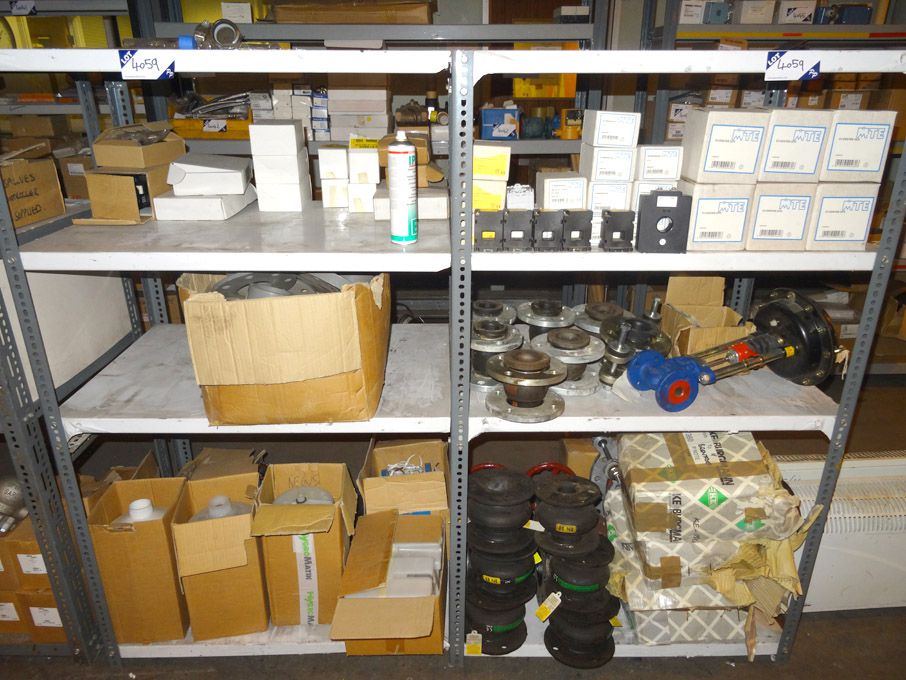 2 bays light duty storage racking with contents inc: 8 pole relays, valves, sensor, filters, Air DP switches etc (unused)