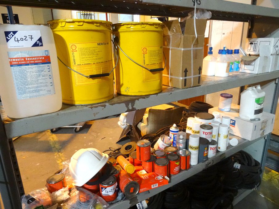 Qty various multi grease, power cleaner, liquid soap, eye wash etc on 2 shelves