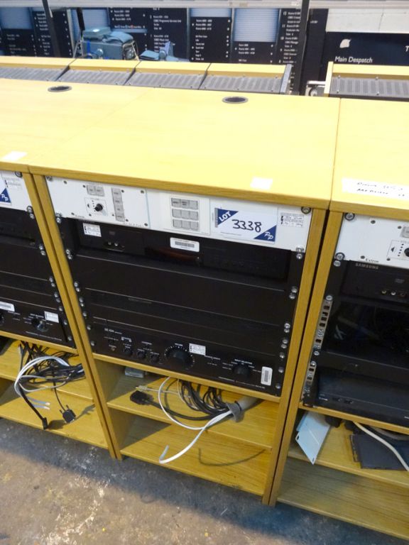 Wooden storage rack with contents inc: Extron MLC 104 IP Plus media link controller, Denon DN-A100 professional integrated amplifier etc