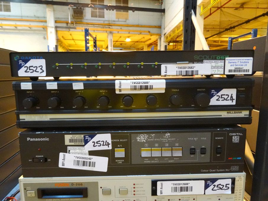 Encoders / Decoders, Chassis, Routers, A/D & D/A converters, sync generators, processors, cameras, microphones, speakers, headphones, clocks, CD / MD players & recorders, amplifiers, matrix mixers, MDU's, KVM swtiches, receivers, servers, lighting rigs, cable, storage media, RF equipment, flight cases, patch panels etc etc