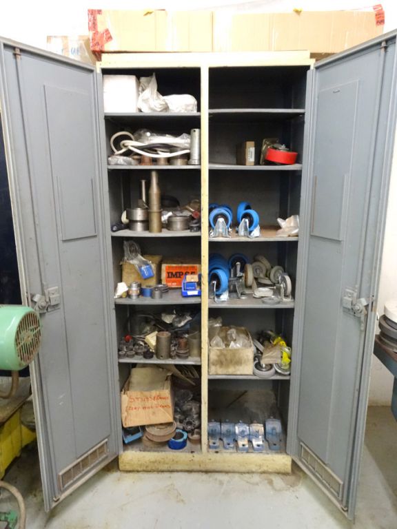 2 door multi shelf metal storage cupboard with contents inc: Qty various castors & bushes etc