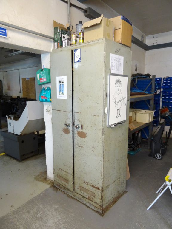 2 door metal storage cupboard with contents inc: drills, taps, reamers, dies, Allen keys etc