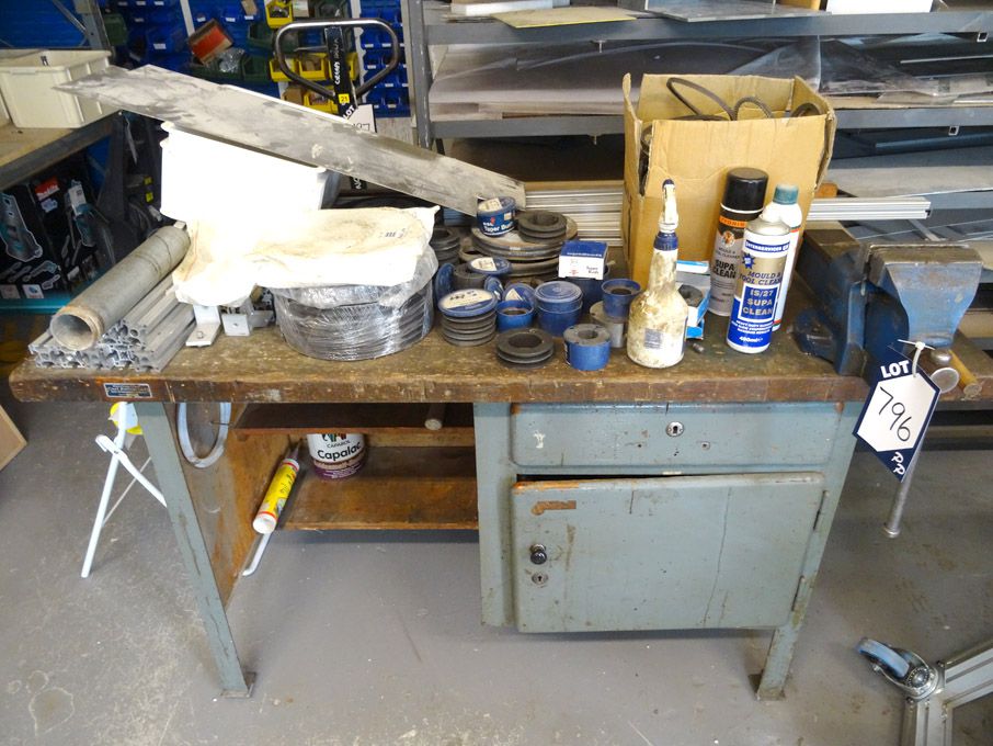 Carl Zollfrank wooden top workbench, 1500x730mm with contents inc: bushes, belts etc