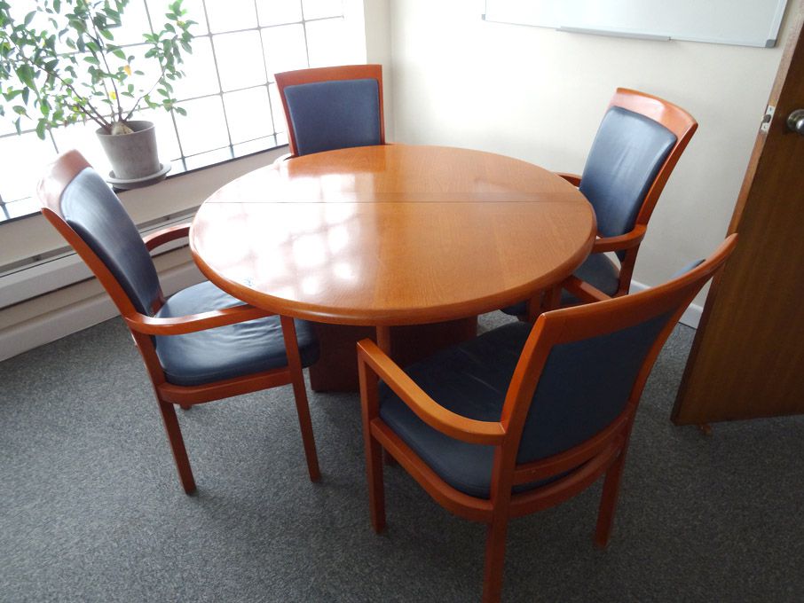 Round wooden meeting table with 4x leather upholst...
