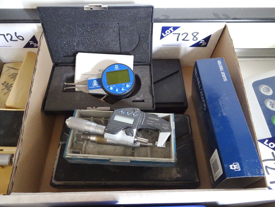 Qty various Mitutoyo digital micrometers, 0-1" & 1-2", Moore & Wright electronic caliper gauge, 5-15mm