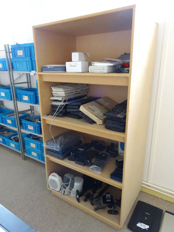 Multi shelf wooded storage rack with contents inc: Epson perfection1250 scanner, various keyboards, Netgear switches, mounting brackets etc