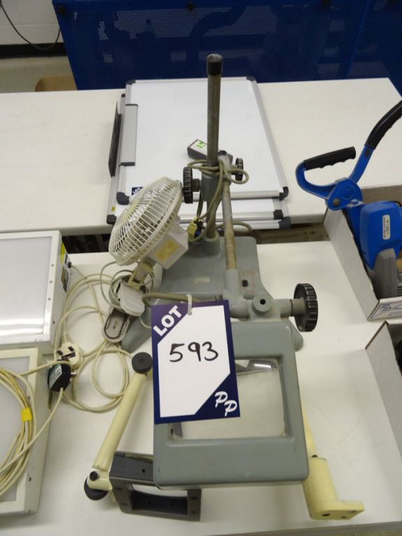 3x office whiteboards, 450x600mm, various magnifier stands & electric fan