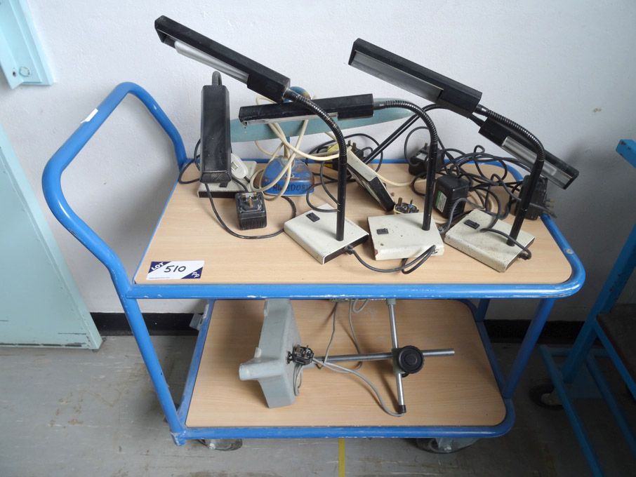 Qty various waste bins, office fans, storage cabinets, ultraviolet lights, light boxes, storage racks, skips, step ladders, safety steps, lockers, foot staplers, boxes, staple guns, various trolleys, vacuum cleaners, fire extinguishers, canteen tables, workbenches etc