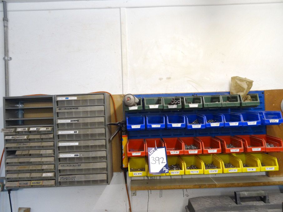 2x multidrawer component cupboards & Qty various linbins with contents on wall mounted rack
