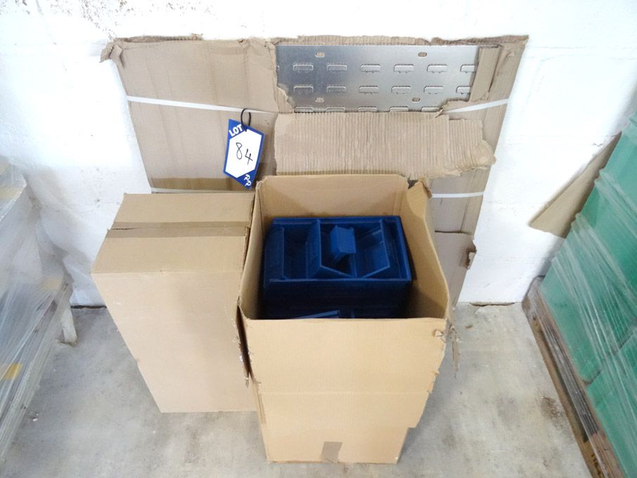 Qty blue plastic lin bins in 2 boxes & metal wall...