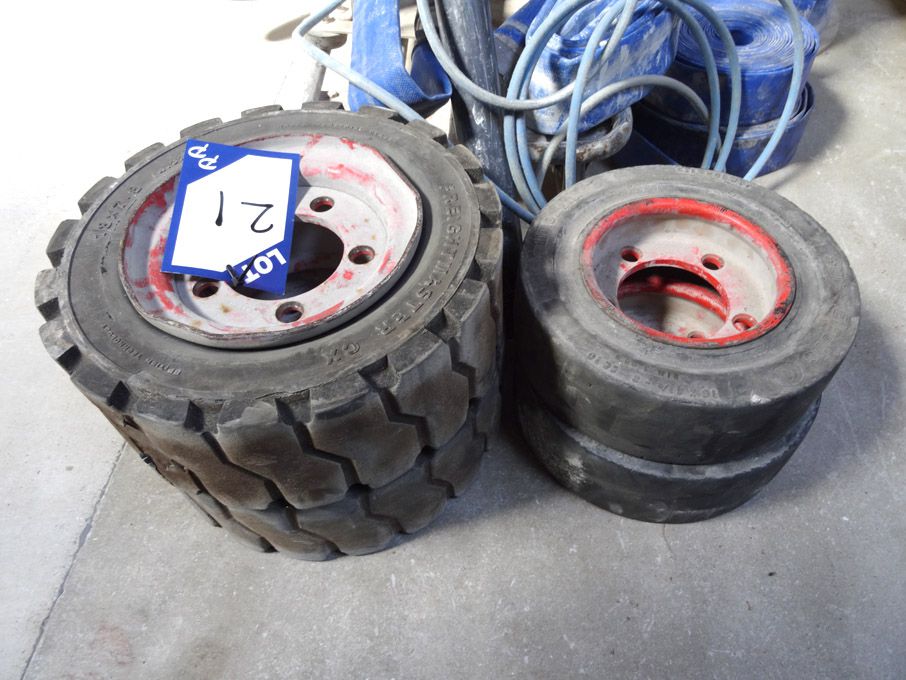 2x Freightmaster CX fork lift truck tyres, 18 x 7 x 8" & 2x Continental Super Elastic 15 x 4 1/2 x 8" tyres on 5 stud steel rims