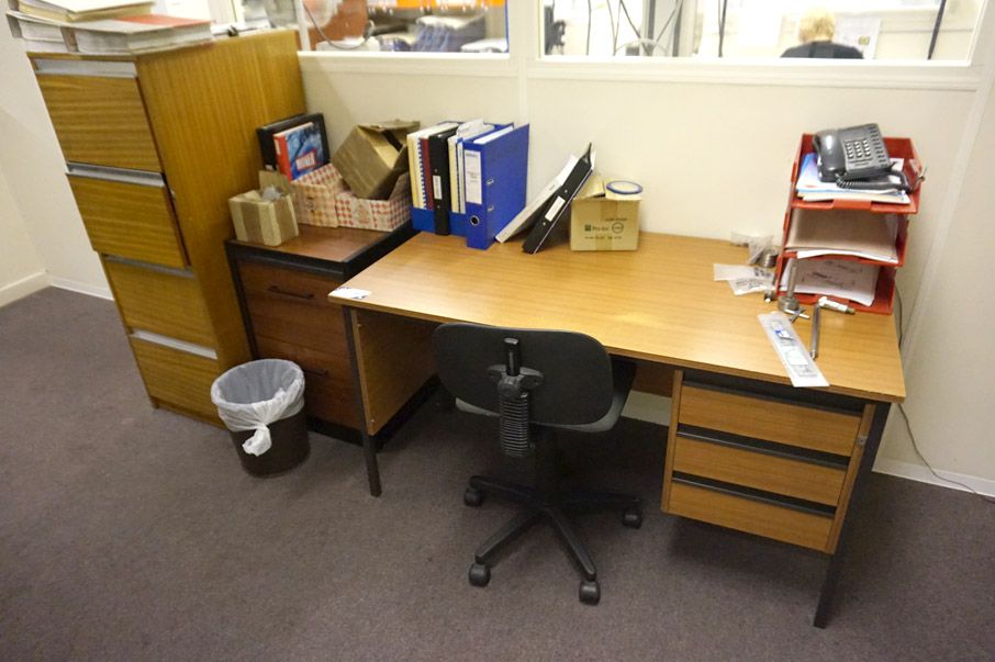 Contents of office inc: pedestal desks, wooden filing cabinets, swivel chairs etc (no electrical equipment included)