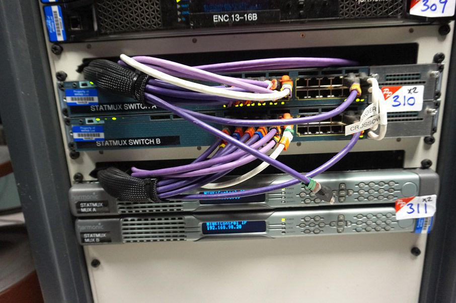 Evertz 7800FR-QT multiframe chassis. Black Magic Design Smart Video Hub 40x40 UltraHD Mixed Format Router, Evertz EQT-32x32 router. Harmonic encoders. Tandberg Remux MX5210 remultiplexer