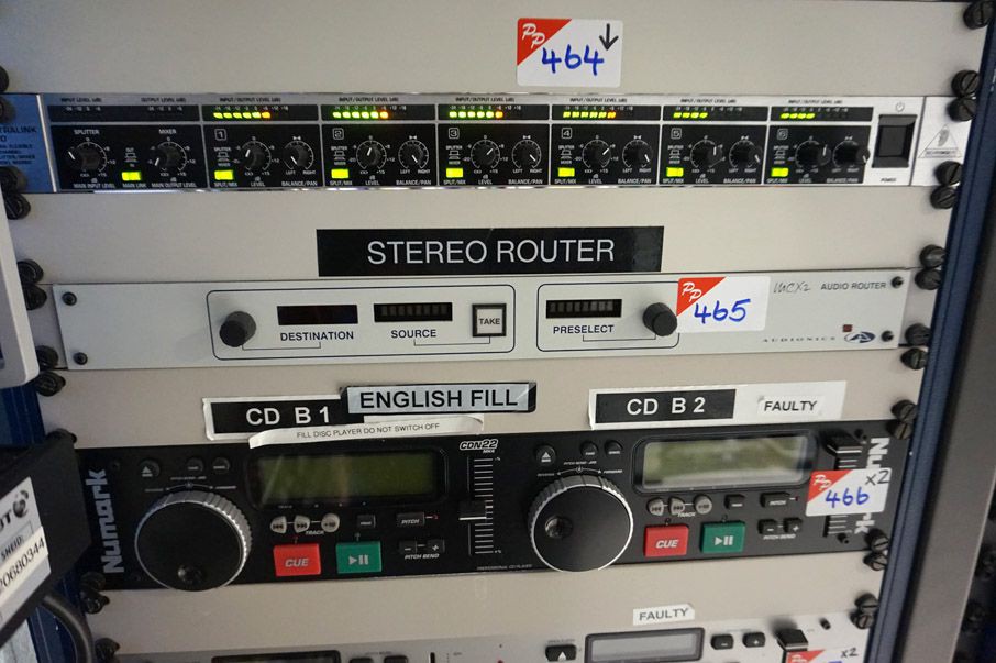Wharton Electronics 482 master clock. Omina AX 8x1 Telos processor. Belkin Omiview Pro 16 port KVM switch. Alice Match Rack Pro interface. Behringer MX882 Ultralink Pro ultra - flexible 8 channel splitter / mixer