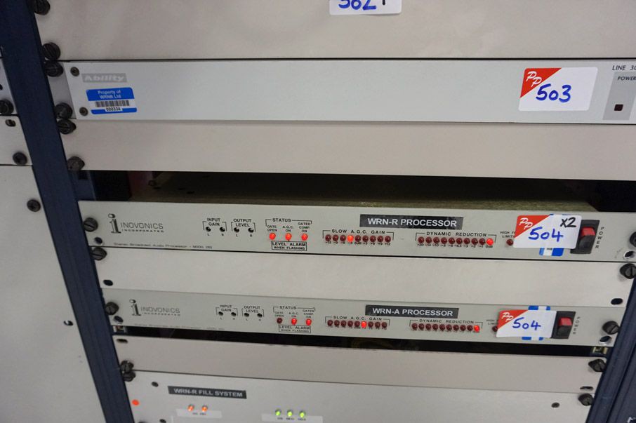 Wharton Electronics 482 master clock. Omina AX 8x1 Telos processor. Belkin Omiview Pro 16 port KVM switch. Alice Match Rack Pro interface. Behringer MX882 Ultralink Pro ultra - flexible 8 channel splitter / mixer