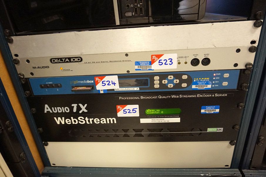 TSL AMU1-CHD audio monitoring unit. Image Server 360 systems broadcast time delay. AEQ Caddy AD & DA convertor. Eyeheight uni panel. M-Audio Delta 1010 digital recording system. Mikrotik 1200 Routerboard rackmount router. Black Magic Design control. Snell & Wilcox CVR45 standards convertor
