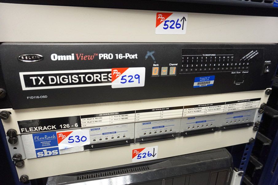 Wharton Electronics 482 master clock. Omina AX 8x1 Telos processor. Belkin Omiview Pro 16 port KVM switch. Alice Match Rack Pro interface. Behringer MX882 Ultralink Pro ultra - flexible 8 channel splitter / mixer