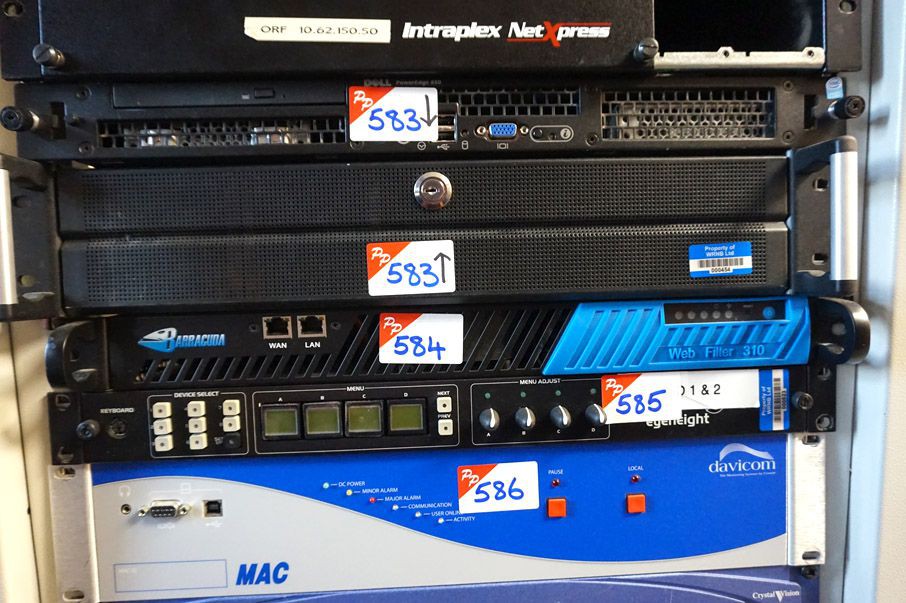 Wharton Electronics 482 master clock. Omina AX 8x1 Telos processor. Belkin Omiview Pro 16 port KVM switch. Alice Match Rack Pro interface. Behringer MX882 Ultralink Pro ultra - flexible 8 channel splitter / mixer