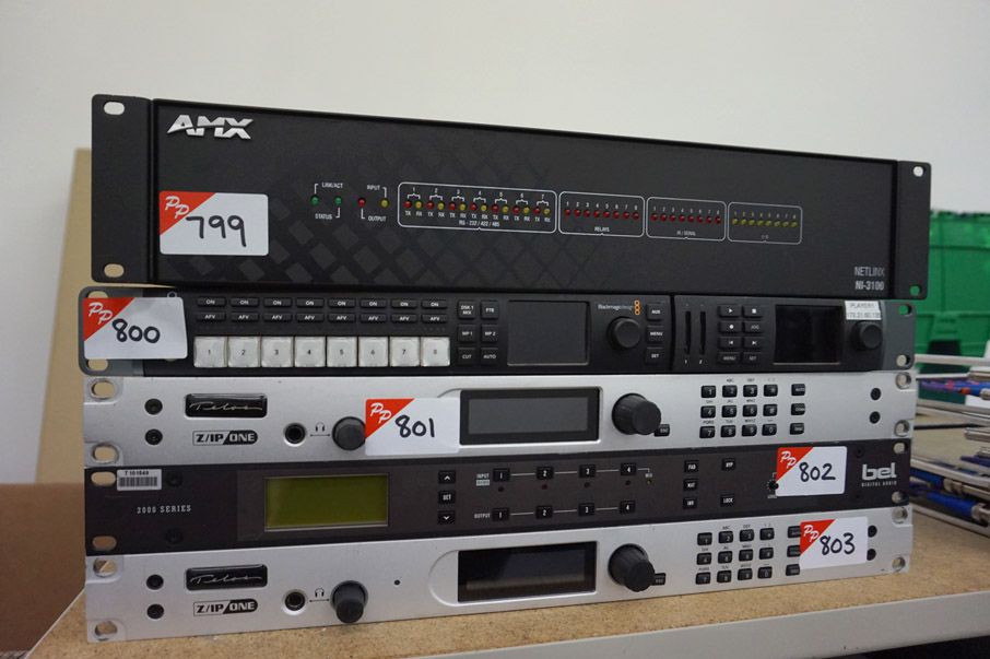 Wharton Electronics 482 master clock. Omina AX 8x1 Telos processor. Belkin Omiview Pro 16 port KVM switch. Alice Match Rack Pro interface. Behringer MX882 Ultralink Pro ultra - flexible 8 channel splitter / mixer