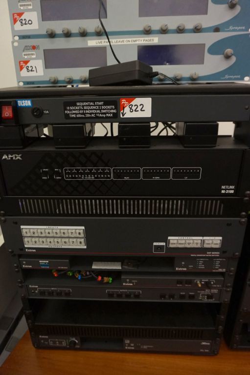 Fixed rack with contents inc: AMX Netlinx NI-3100 integrated home automation controller, Extron DXP series digital cross point matrix switcher, HDMI audio extractor, mixer / volume controller, etc