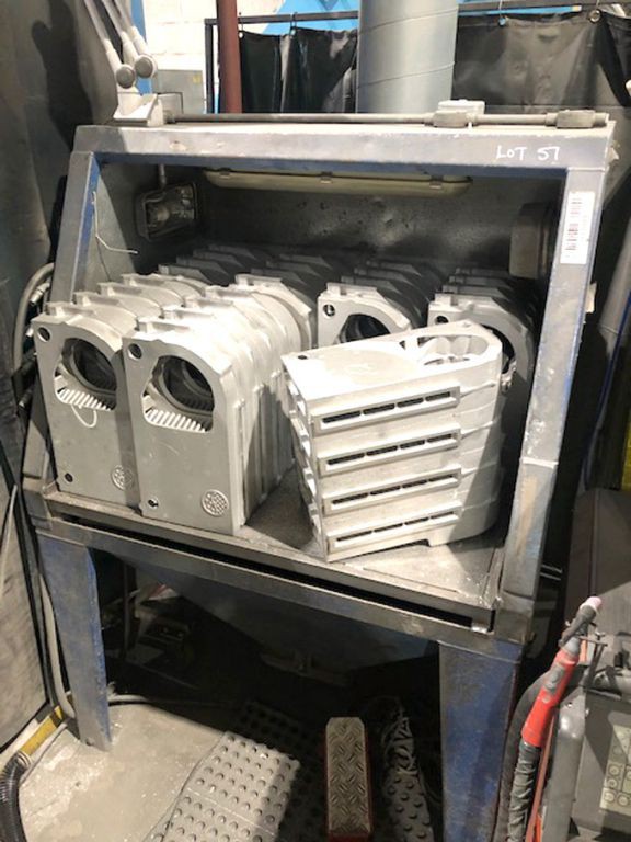 Straaltechnick UK Ltd front loading aluminium hook blast, 1400mm wide aperture, twin wheel, Siemens Simatic OP7 control, reclaim system & extraction, load / unload station