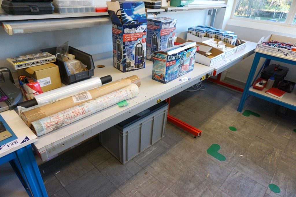 Qty various size electronic workbenches, tables, trolleys, lockers, multi compartment storage racks
