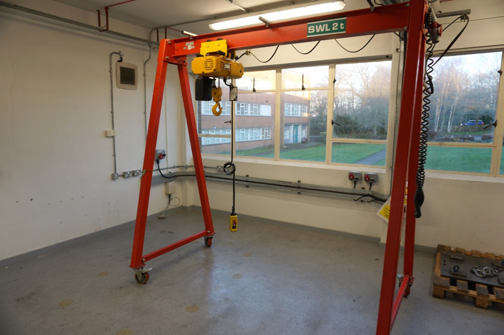 Pelloby 2 ton SWL mobile ‘A’ frame (2003) with 2 ton electric chain hoist, pendant control (2007)