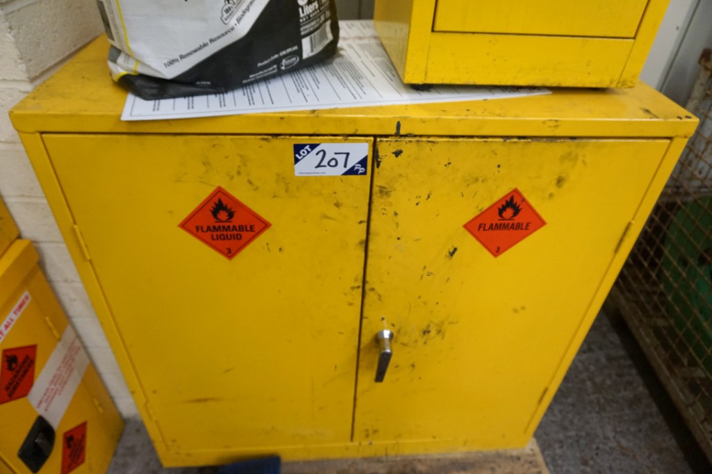 Qty various size flammable storage cupboards. Qty various mobile storage racks, wall type storage racks