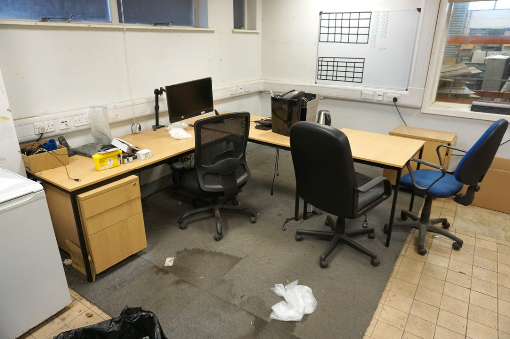 Contents of office inc: 4x light oak effect tables, Qty various chairs, HP LaserJet printer, paper shredder, monitor etc