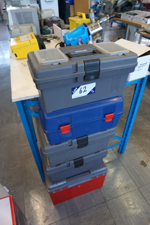 Qty various SIP, Clarke, Duratool etc tool boxes, industrial fans, heat guns, plastic storage boxes