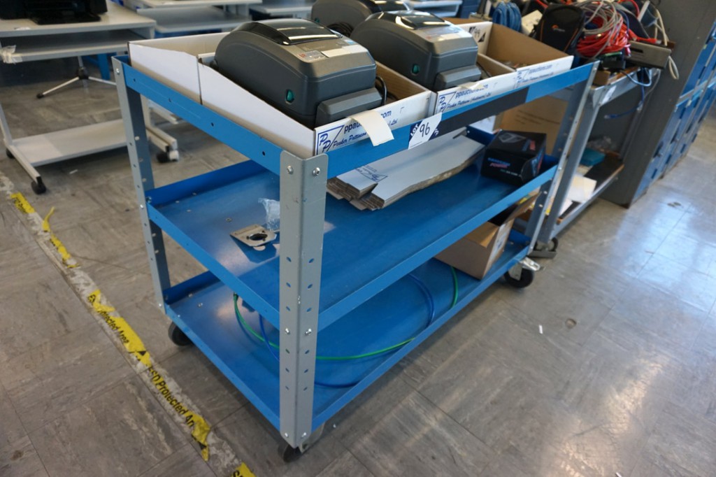 Qty various size electronic workbenches, tables, trolleys, lockers, multi compartment storage racks